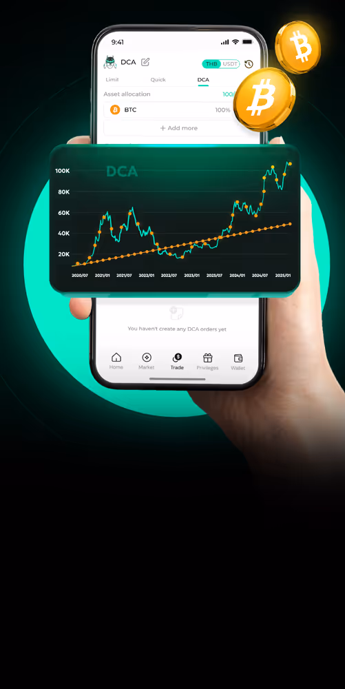 บริการ DCA (Dollar Cost Averaging) กลยุทธ์การลงทุนแบบทยอยซื้อสินทรัพย์ด้วยจำนวนเงินที่เท่ากันในทุกช่วงเวลา ไม่ว่าราคาจะขึ้นหรือลง