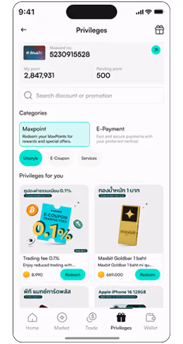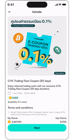 - ทุกการซื้อ-ขายสินทรัพย์ดิจิทัลผ่าน Maxbit หากจ่ายด้วยเงินบาท (THB) ทุก ๆ 1,000 บาท จะได้รับ 1 Max Point