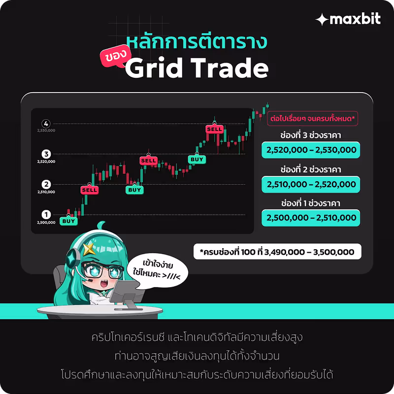 ฟีเจอร์ Grid Trading ของแพลตฟอร์ม Maxbit เป็นกลยุทธ์การเทรดแบบอัตโนมัติ ที่ช่วยให้คุณทำกำไรจากความผันผวนของราคาในช่วงที่ตลาดแกว่งตัว (sideway) ใช้หลักการตั้งคำสั่งซื้อ (Buy) และขาย (Sell) หลาย ๆ ระดับราคาภายในช่วงราคาที่กำหนดไว้ ระบบจะสร้าง “ตารางคำสั่ง” หรือ กริด (Grid) แบบอัตโนมัติ แล้วทำการซื้อเมื่อราคาตก และขาย เมื่อราคาขึ้น โดยไม่ต้องจับจังหวะตลาดเอง